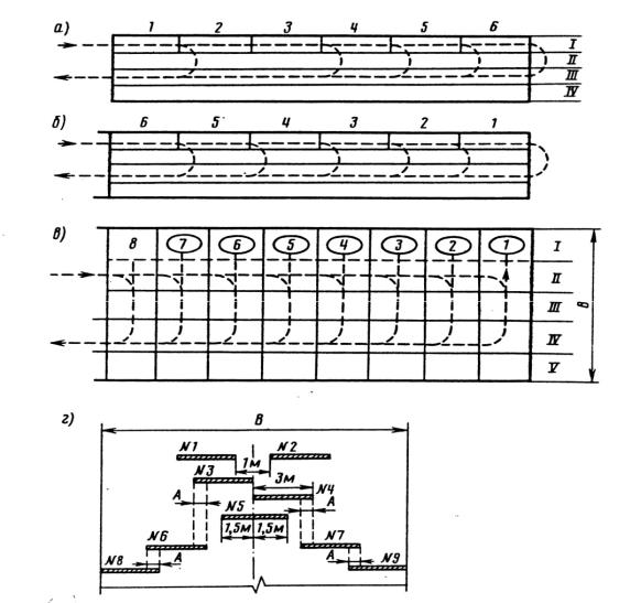 № 1…9 – последовательность проходов бульдозера; А – перекрытие следа предыдущего прохода; В – ширина захватки