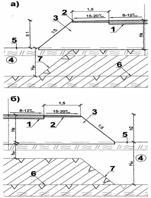 Рис. 6.1. Поперечные профили ИВПП и РД: а – двухскатный поперечный профиль ИВПП при первом принципе проектирования; б – то же, при втором; 1 – аэродромные покрытия на ВПП и РД; 2 – отмостки по краям покрытий; 3 – термоизолирующие насыпи; 4 – естественные основания насыпей; 5 – мохорастительный покров; 6 – верхняя граница вечномерзлых грунтов (ВГВМГ) в естественных условиях; 7 – ВГВМГ после строительства; h1 h2 – высоты термоизолирующей насыпи соответственно при первом и втором принципах проектирования, определяемые теплотехническим расчетом; Нк – величина оттаивания аэродромных конструкций; Ндс – мощность деятельного слоя в районе строительства
