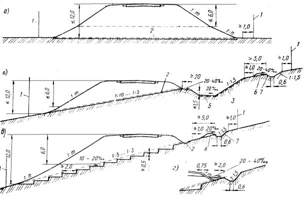 в– на косогоре 1 : 5 – 1 : 3; г – деталь сопряжения насыпи при отсутствии