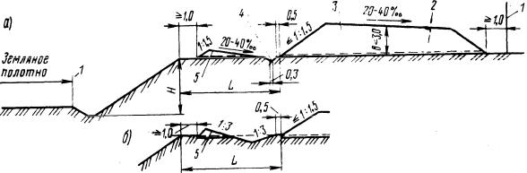 При косогорности круче 1 : 5 перед устройством насыпи на косогоре нарезают уступы. Высота каждого уступа не более 0,5 м (рис. 4.11, в).