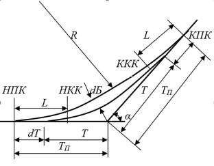 При устройстве закругления с переходной кривой происходит смещение круговой кривой к центру закругления на величину dБ (рис. 6.4).