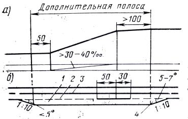 Дополнительные полосы проезжей части для грузового движения в сторону подъема при смешанном составе транспортного потока следует предусматривать на участках дорог категории II, исключая дороги с четырьмя полосами движения, а также на участках дорог категории III при интенсивности движения свыше 4000 приведенных ед./сут (достигаемой в первые пять лет эксплуатации), при продольном уклоне более 30 ‰ и длине участка свыше 1 км, при уклоне более 40 ‰ и длине участка свыше 0,5 км (рис. 7.3). Ширину дополнительной полосы назначают равной 3,5 м. Дополнительные полосы начинаются до начала подъема и заканчиваются после подъема за 50 м и более.