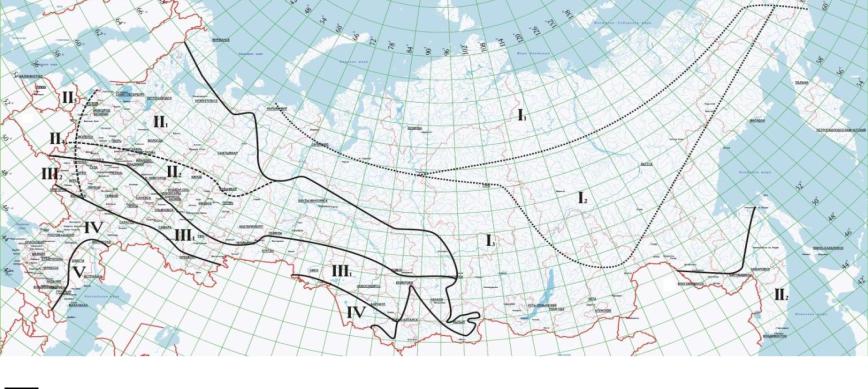 Рис. 8.3. Дорожно-климатическое районирование России Примечания: 1. При соответствующем обосновании общее дорожно-климатическое районирование территории Рос-