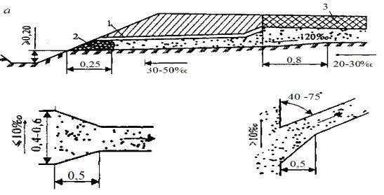 а – разрез по полотну дороги; б, в – примыкание воронки к песчаному слою при малых и больших уклонах: 1 – прослойка дерна или дорнита; 2 – щебень или гравий; 3 – дорожная одежда