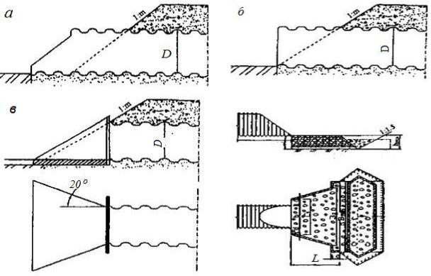 Металлические гофрированные трубы (МГТ) допускается проектировать без устройства оголовков (рис. 12.3, а, б). При этом нижняя часть трубы должна выступать из насыпи на уровне ее подошвы не менее чем на 0,2 м. Для уменьшения расхода металла выступающая из насыпи часть трубы срезается плоскостью параллельной откосу насыпи. Гофрированная трубы со срезанным концом должно выступать из тела насыпи не менее чем на 0,5 м.