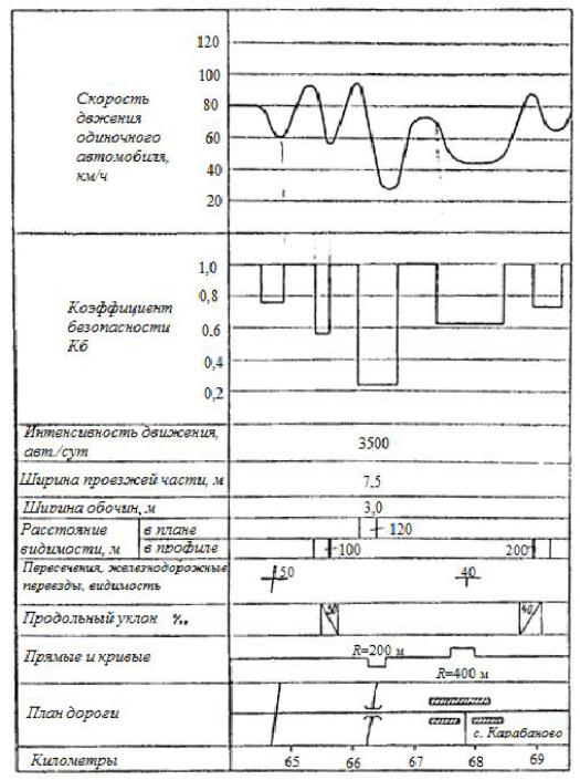 Для оценки соответствия размеров отдельных элементов дороги и их сочетаний требованиям безопасности и удобства движения на основе расчетов на ЭВМ или по вспомогательным таблицам строят эпюру изменения скорости одиночного автомобиля в зависимости от параметров продольного профиля и плана без учета ограничений, предусматриваемых Правилами дорожного движения и устанавливаемыми знаками.