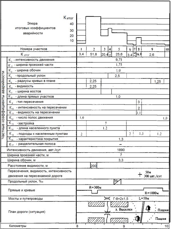 При построении графика коэффициентов аварийности дорогу анализируют по каждому показателю, выделяя однородные по условиям участки. При этом необходимо учитывать, что влияние опасного места распространяется на прилегающие участки, где возникают ощутимые помехи для движения.