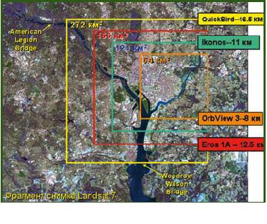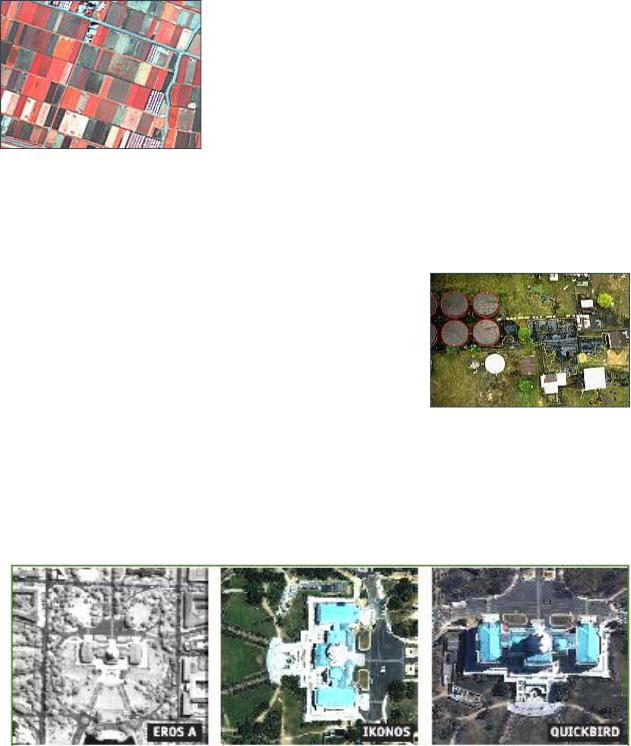 На рис.1.21 демонстрируется информации на снимках, получаемых со спутников: EROS A (разрешение 1,8 м), IKONOS (разрешение 1 м) и QUICKBIRD (разрешение 61 см).