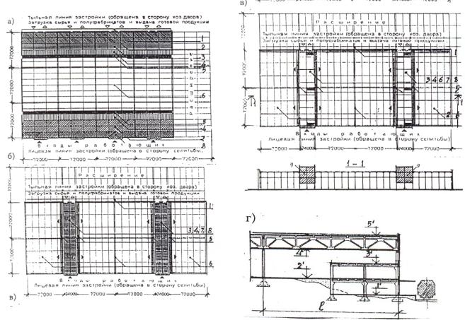 а - поперечное зонирование; б - продольное зонирование; в - смешанное зонирование; г – использование различных уровней; 1 - автомобильная и железнодорожная платформа; 2 - зона складов, пожаро- и взрывоопасных цехов и цехов с избыточными тепловыделениями вредностями; 3 - зона подсобно-производственных помещений; 4 – зона вентиляционных и энергетических систем; 5 - основной транспортный проезд; 6 - зона основных производ-ственных цехов; 7 – зона ОКБ и опытных установок; 8 – зона административно-бытовых и лабораторных помещений; 9 - многоэтажная вставка со свободным нулевым уровнем; l' – цокольный этаж - технологические подвалы, тяжелое инж. техн. оборудование, склады, обслуживание жел.-дор. транспортом, частично бытовые; 2' - первый этаж - проезды, подсобно-производств. помещения, склады, обслуживаемые автотранспортом, частично бытовые; 3' - антресоль конторы, лаборатории, ОКБ, бытовые, легкие сантехн. системы; 4' -низ перекрывающей конструкции инж-техн. коммуникации, легкие сан-техн. системы, частично бытовые, мелкие подсобные помещения; 5' - уровень плоской кровли - вентиляционные шахты, отдых работающих, инж. оборудование здания, открытые коммуникации.