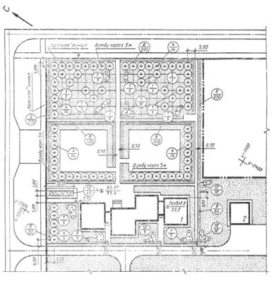Расстояние от зданий и сооружений до деревьев и кустарников следует принимать не менее: ствол дерева от стены здания - 5м, оси железнодорожного пути - 5м, опоры или мачты 4м, края тротуара - 0,7м, бортового камня - 2м. Кустарник от стены здания - 1,5м, оси железнодорожного пути - 3,5м, края тротуара - 0,5м бортового камня - 1,2м. Расстояния между деревьями - 3м, кустарниками - 0,4м.