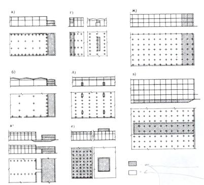 венны первая или вторая ступень в системе культурно-бытового обслуживания. В зависимости от характера производства и общей объемнопланировочной структуры комплекса, бытовые помещения могут размещаться в отдельно стоящем здании, в пристройке к производственному зданию и во встроенных объемах производственного здания (рис. 3).