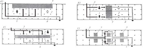 а – схема I; б - схема II; в – схема III; г - схема IV;1 – мужская гардеробная рабочей одежды; 2 – тоже домашней одежды; 3 – женская гардеробная рабочей одежды; 4 – то же, домашней одежды; 5 – «грязные» людские потоки; 6 – «чистые» людские потоки; 7 – душевая.
