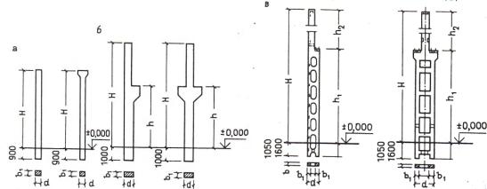 В зданиях без мостовых кранов устанавливают колонны без консолей (рис. 8а.), а в зданиях с мостовымиДкранами колонны с консолями, на которые опирают подкрановые балки (рис.8б,в). По местонахождению в здании на крайние, средние и фахверковые, располагаемые у торцовых и крайних продольных стен. В массовом промышленном строительстве при высоте помещений от пола до низа конструкций покрытий до 10,8 м применяют колонны прямоугольного сеченияИ(серия КЭ.01-49) для зданий без мостовых кранов и оборудованных мостовыми кранами, а при больших высотах (10,8 – 18 м) и оборудованных мостовыми кранами – двухверковые (серия КЭ.01-52). Марки колонн для определенного типа здания подбирают в зависимости от грузоподъемности крана, шага колонн, пролета и высоты здания, нагрузки от покрытия и давления ветра. По сравнению с колоннами прямоугольного сечения двухветвевые колонны имеют повышенную жесткость, но они более трудоемки в изготовлении. Применяют их в зданиях с высотой более 10,8 м. На изготовление колонн двутаврового сечения бетона расходуется на 25-30% меньше, чем на колонны прямоугольного сечения. Размеры колонн в поперечнике принимают: прямоугольного сечения - от 400х400 до 500х800