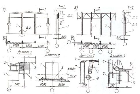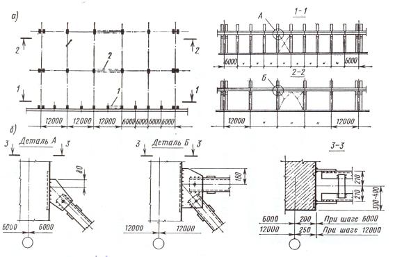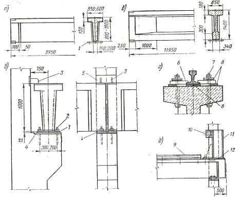 а – длина шага колонн 6 м; – то же 12 м; в – крепление балок к колоннам; г – крепление кранового рельса к алке; д – устройство упора для мостового крана; 1 – опорный стальной лист; 2 – анкерный олт; 3 – стальная пластина; 4, 5 – закладные