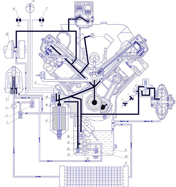 – предохранительный клапан радиатора; – перепускной клапан центробежного фильтра; 3 – кран выключения масляного радиатора; 4 – центробежный фильтр 1очистки масла; 5 – указатель уровня масла2; 6 – лампа сигнала засорения фильтра; 7 – лампа сигнала аварийного давления масла; 8 – указатель давления масла; 9 – поддон картера; 10 – предохранительный клапан; 11 – масляный радиатор; 12 – маслоприёмник; 13 – предохранительный клапан; 14, 15 – секции насоса; 16 – дифференциальный клапан; 17 – масляный фильтр; 18 – главная магистраль;