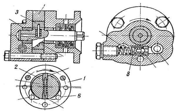 под давлением в магистраль. При повышении давления выше допустимого масло через клапан 7 перепускается во всасывающую полость.