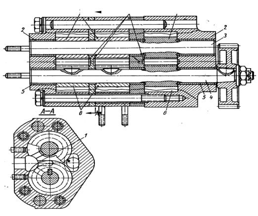 В трёхсекционном насосе, представленном на рис. 2.6, секции располагаются последовательно. Вал 4 приводит в движение все ведущие шестерни, ведомые располагаются на одной оси 3. При работе ДВС между зубьями шестерён 6 7 создаётся большое давления, приводящее к повышенному износу вала 4, оси 3 и втулок 2 и 5. Для уменьшения давления на торцах корпуса насоса и торцевых крышек фрезеруют канавки1. По этим канавкам масло выдавливается в нагнетающую полость. В случае применения косозубых шестерён необходимость в разгружающих канавках отпадает.