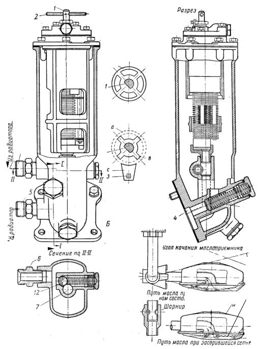 Фильтрующий элемент пластинчато-щелевого фильтра грубой очистки, представленный на рис. 2.14, а, состоит из набора двух конфигураций пластин – 9 10, набранных поочерёдно на стержне 1. В р е- зультате между ними образуется щель для прохода масла. Стержень 1 проходит через крышку фильтра связан с воротком 2. Пластины 11 набраны на стержне 3 располагаются между пластинами 9 и 10. При повороте с помощью воротка 2 стержня 1 вращающиеся элементы фильтра очищаются от примесей пластинами 11. Масло от насоса поступает в камеру 4 корпуса фильтра и через штуцер 5 и клапан 7 подаётся к фильтрующему элементу. У прогретого ВС масло через штуцер 5 поступает в масляный радиатор, а затем через штуцер 6 к фильтрующему элементу. В холодном ДВС давление масла повышено, необходимости в охлаждении масла нет, клапан 7 перепустит масло в камеру фильтрующего элемента. При возрастании давления масла в случае засорения