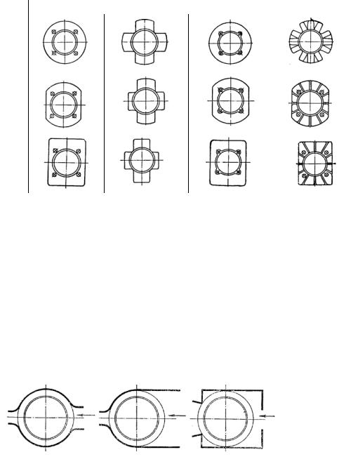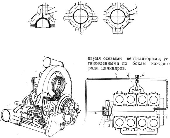 Схему системы воздушного охлаждения определяет число цилиндров ДВС и их расположение относительно друг друга, число, тип вентиляторов и их установка относительно цилиндров ВС, способ подвода воздуха – нагнетание или всасывание (рис. 1.7).