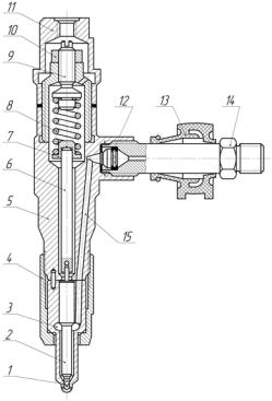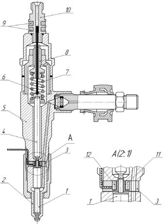 Основным узлом форсунки является распылитель, от состояния которого зависит экономичность двигателя и токсичность отработавших газов. На рис. 4.1 показан общий вид форсунки двигателя Ярославского моторного завода. Распылитель имеет четыре сопловых отверстия 1 диаметром 0,25 – 0,35 мм, иглу 2 с диаметром направляющей 4,5 – 6,0 мм, корпус 3. Игла прижимается к корпусу при помощи усилия пружины 8, через опорную шайбу 7 и шток 6 (штангу). Усилие пружины 8 регулируется винтом 9. В современных форсунках шток 6 удален, добавлена «проставка», расположенная между корпусом форсунки 5 и корпусом распылителя 3, а усилие пружины регулируется прокладками различной толщины.