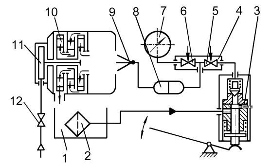 Рис. 4.4. Гидравлическая схема серийного стенда КИ-3333: 1 – топливный бак; 2 – фильтр тонкой очистки; 3 – насос высокого давления с ручным приводом;