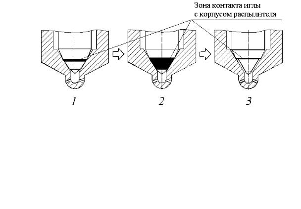 Рис. 4.6. Вид уплотнения посадочного конуса нового (1), изношенного (2) и восстановленного (3) распылителей