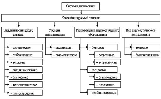 Диагностические системы характеризуются большим разнообразием технических средств измерения и обработкой сигнала, а также методов и правил решения диагностических задач. Классификация диагностических систем представлена на рис. 5.2 [18].
