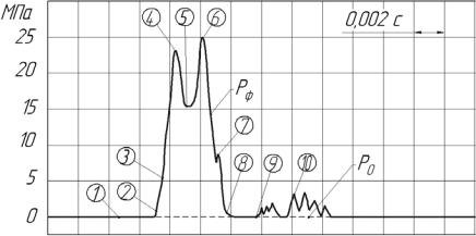 На эталонном мпульсе давления выделим характерные точки и участки: 1 − остаточное давление в трубопроводе, измеренное относительно нулевой линии; 2 − начало роста давления на входе в форсунку; 3 − пауза роста давления вследствие поднятия нагнетательно-