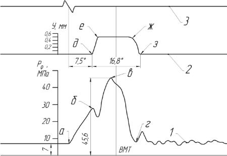 вфорсунку; 2 – перемещение иглы форсунки; 3 – отметка геометрического начала подачи топлива