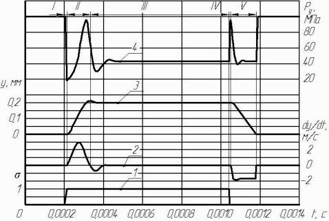 1 − изменение управляющего сигнала в обмотке электромагнитного клапана; 2 − скорость движения иглы; 3 − перемещение иглы распылителя форсунки; 4 − давление топлива над управляющим поршнем; I − время от начала подачи управляющего сигнала на обмотку