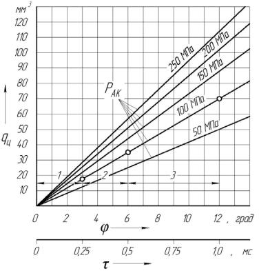 На рис. 6.9 показана зависимость величины цикловой подачи от продолжительности впрыска в мс и в градусах от давления топлива в