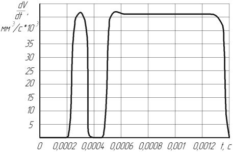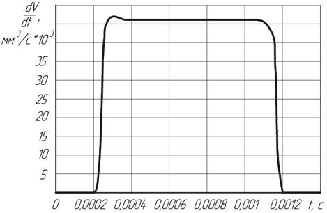 Площадь под кривой в определенном масштабе представляет собой действительную подачу топлива за цикл (впрыск). Для продолжительности впрыска 0,001 с и средней скорости впрыскивания dV/dt, равной 47∙103 мм3/с, количество поданного топлива за цикл составит 47 мм3.