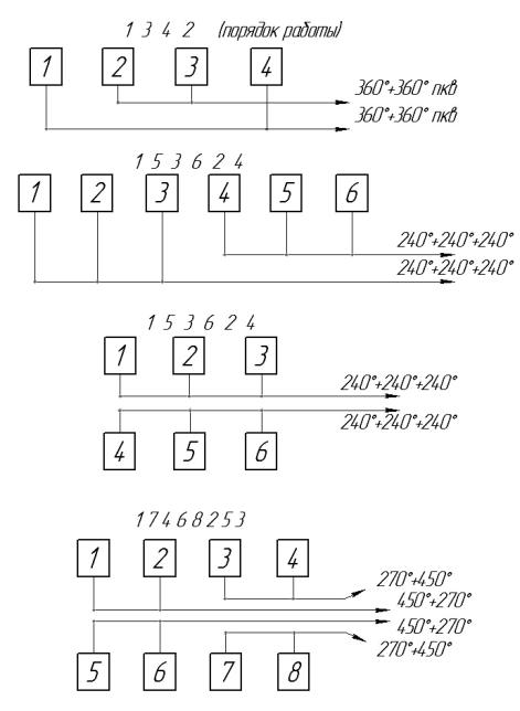 Рис. 8.5. Примеры разделения выпускных трубопроводов и объединения их в группы при импульсной системе наддува