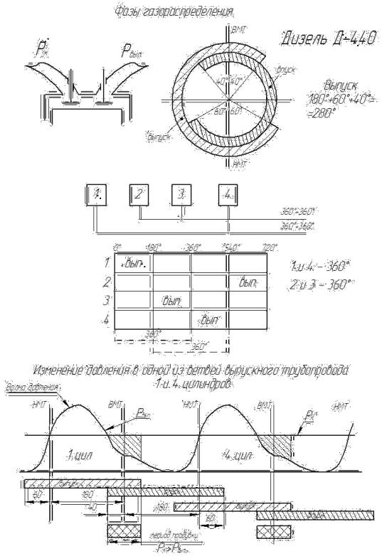 Рис. 8.6. Разделение цилиндров двигателя 4ЧН 13/14 и изменение давления на выпуске