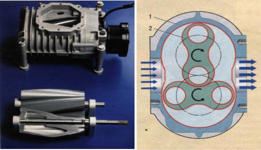 Рутс. В нем порции воздуха проталкиваются лопастями роторов к впускному коллектору. Вал нагнетателя жестко связан с коленчатым валом двигателя [33].
