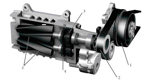 На рис. 9.2 показан привод роторного нагнетателя. От вала двигателя крутящий момент передается при помощи клиноременной передачи на шкив ведущего вала роторного нагнетателя (компрессора). При помощи шестеренной передачи (ведущей и ведомой шестерни) приводится во вращение ведомый вал. Роторы жестко закреплены на валах и вращаются в разные стороны.