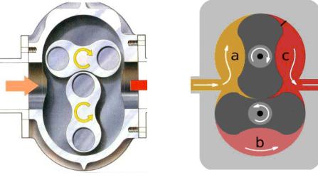 (зачерпывает) воздух (b) и подобно верхнему ротору переносит его из полости всасывания (а) в полость нагнетания (с). При вращении роторов объем всасывающей полости увеличивается в размере и давление в ней становится меньше атмосферного. Под действием разности давлений воздух из атмосферы поступает во впускное отверстие и в камеру всасывания. За один оборот (3600) роторов происходит два нагнетания воздуха.