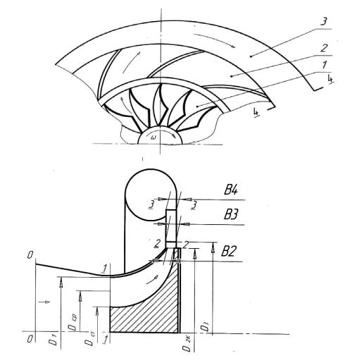 В результате расширения каналов диффузора (сечение 2–2 и 3–3) и улитки (сечение 3–3 и 4–4) скорость воздуха снижается, а тем-