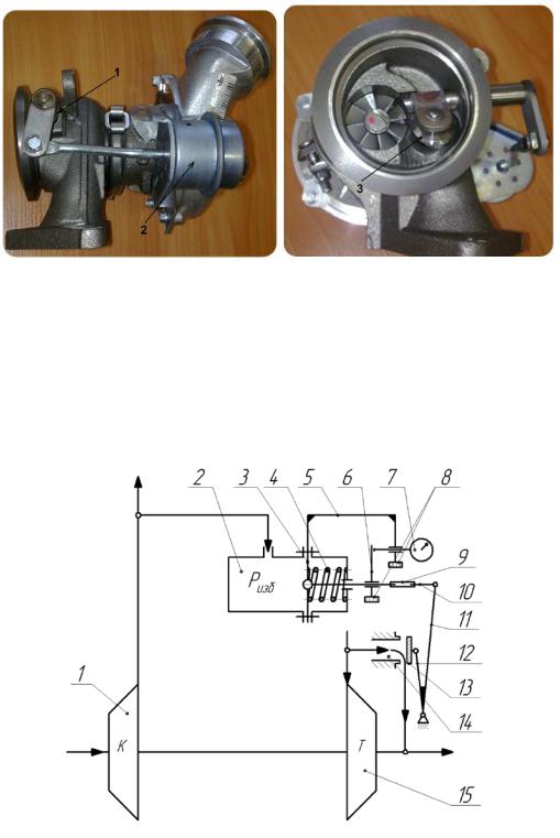 сообщена с выходом компрессора. Перепускной канал, закрываемый заслонкой 3, соединен каналом с входом в турбину. Давление наддува передается на мембрану, поджатую пружиной. При величине давления больше оптимального значения мембрана, преодолевая усилие пружины, перемещает шток, который через систему рычагов открывает заслонку 3. При этом уменьшается количество газа, направляемое на колесо турбины, и снижается частота вращения вала.