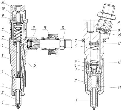 11 – колпак; 12 – сетчатый фильтр; 13 – уплотнитель; 14 – штуцер; 15 − канал Форсунка с короткой штангой (б): 1 – корпус распылителя;