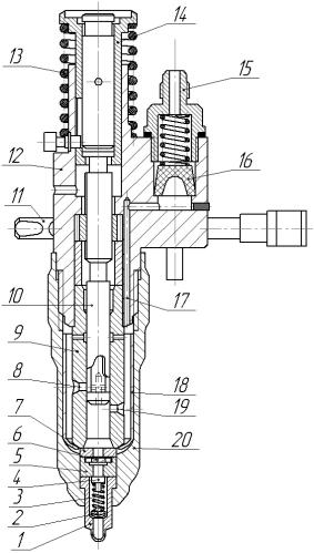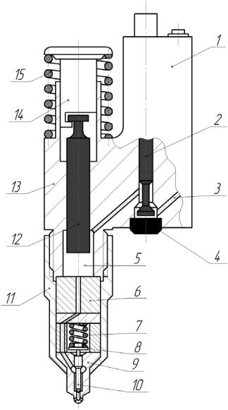 9 – корпус распылителя; 10 – игла распылителя; 11 – гайка стяжная; 12 – плунжер; 13 – корпус форсунки; 14 – толкатель; 15 – пружина