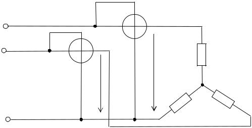 На этой схеме токовые (последовательные) обмотки ваттметров включены в фазы А и В, а потенциальные (параллельные) обмотки – на линейные напряжения U ΑC и U BC . Активная мощность нагрузки