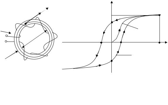 Рис. 5.3. Тонкостенная тороидная катушка (а) и кривые ее намагничивания (б): 1 – кривая первоначального намагничивания;