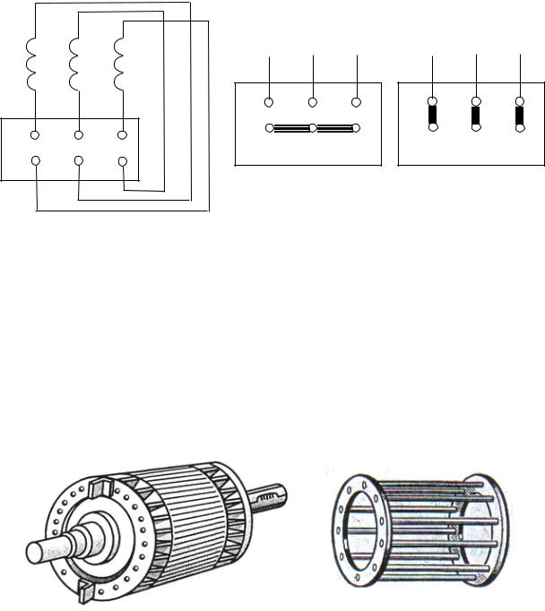 Рис. 7.2. Схема подключения фаз обмоток статора к клеммной коробке (а); соединение выводов фаз обмоток по схеме «звезда» (б)