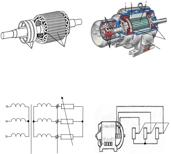 Три кольца жестко насажены на вал ротора через изоляционные прокладки. На кольца накладываются щетки, которые размещены в щеткодержателях, укрепленных на одной из подшипниковых крышек (рис. 7.4, б). Через щетки и кольца обмотка ротора подключена к клеммной коробке. К выводам такой обмотки обычно подключаются добавочные сопротивления Rд в виде трехфазного реостата (рис. 7.5).