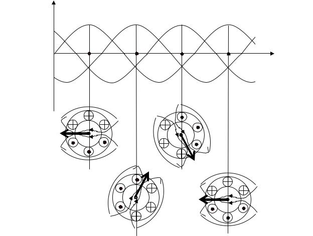 Рис. 7.6. График трехфазной системы токов и упрощенные картины результирующего магнитного поля для четырех моментов времени: