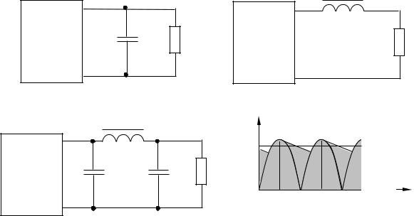 Рис. 10.10. Электрические схемы сглаживающих фильтров: емкостного (а); дроссельного (б); П-образного LC-фильтра (в)