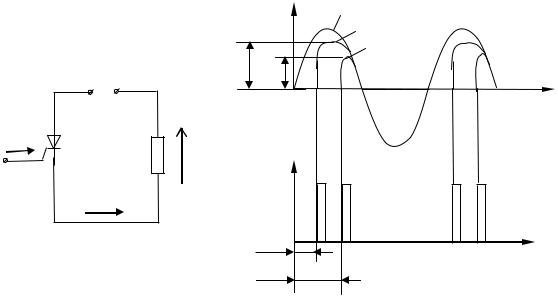 Простейшим тиристорным выпрямителем является однополупериодный (рис. 10.16). В основную цепь тиристора между анодом и катодом подается переменное напряжение, амплитуда которого меньше напряжения включения тиристора. Поэтому при отсутствии управляющего импульса тиристор закрыт.
