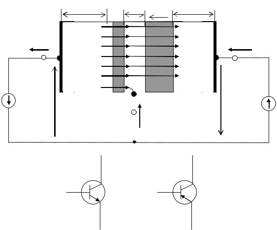 Плоскостной биполярный транзистор представляет собой трехслойную структуру типа p-n-p или типа n-p-n (рис. 10.19). Транзистор называется биполярным потому, что физические процессы в нем связаны с движением носителей заряда обоих знаков (свободных дырок и электронов). Средний слой транзистора называется базой Б, один крайний слой – коллектором К, а другой крайний слой – эмиттером Э. Каждый слой представляет собой электрод и имеет вывод. Посредст-