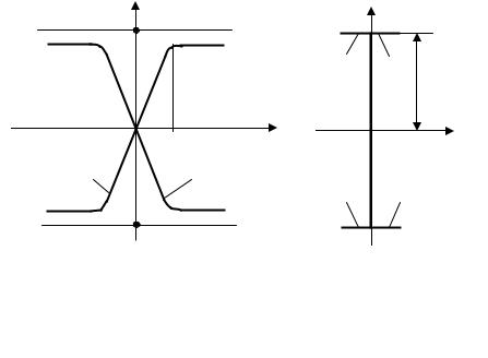 Рис. 10.42. Амплитудные характеристики реального (а) и идеального (б) ОУ: 1 – по инвертирующему входу;